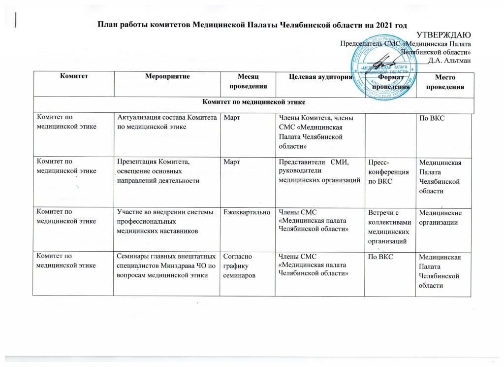 План работы комитетов Медицинской Палаты Челябинской области на 2021 год.